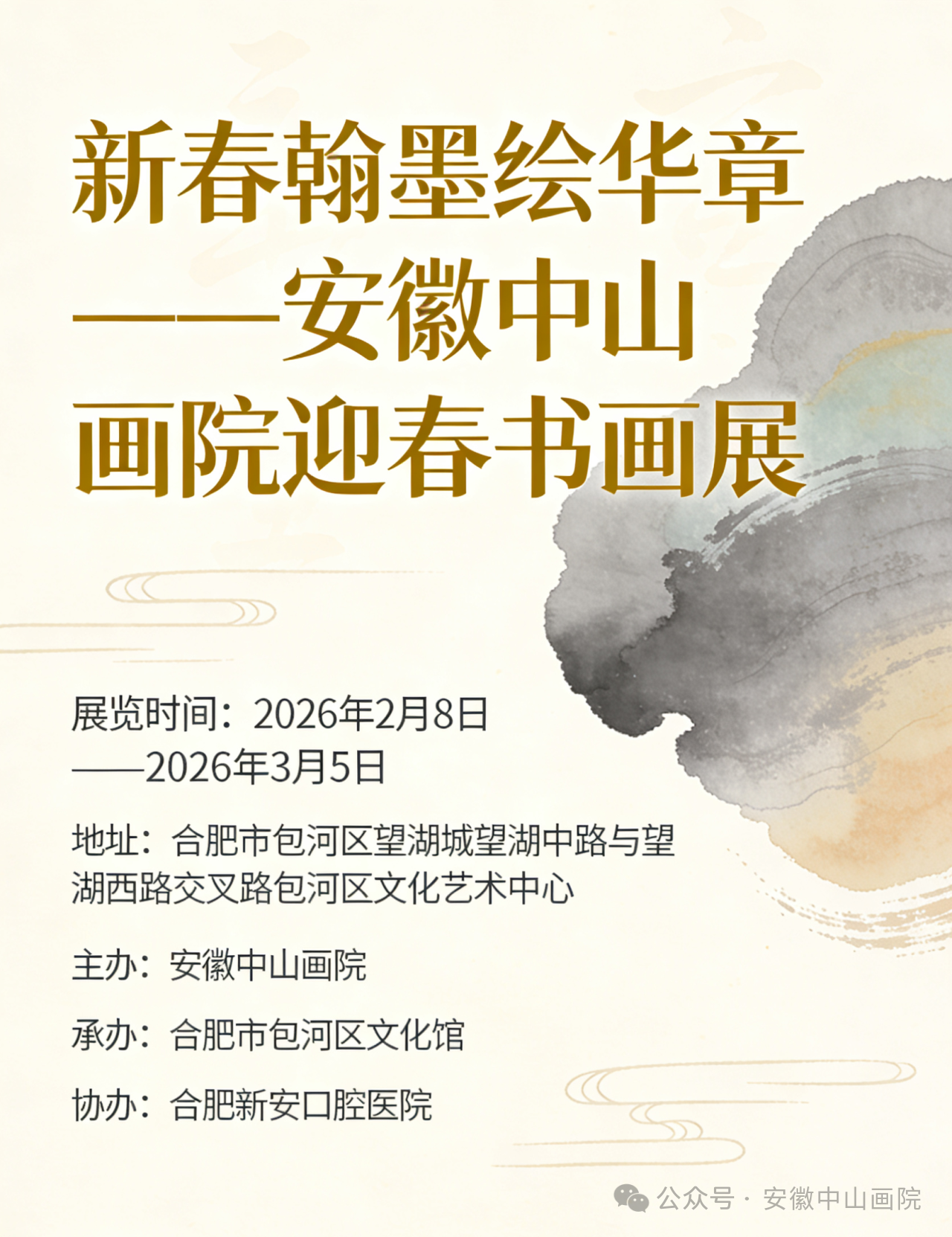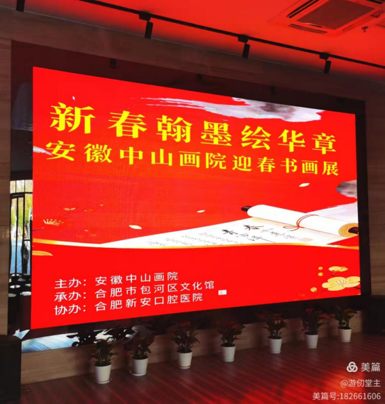 安徽中山画院新春书画展,于2026年2月8日,在合肥包河区文化艺术中心举行。本次展览由安徽中山画院主办,合肥市包河区文化馆承办,合肥新安口腔医院协办。